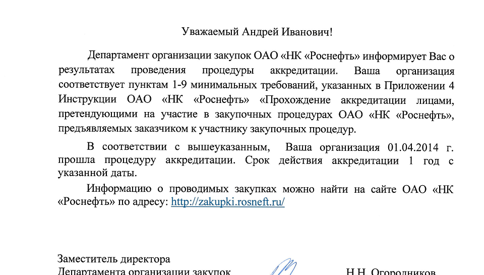 Получено официальное подтверждение успешного завершения процедуры аккредитации нашей компании в качестве лица, претендующего на участие в закупочных процедурах ОАО "НК "Роснефть" на 2014 год. Эту процедуру ООО "ТД "Автоматика" проходит начиная с 2011 года, каждый раз с положительным результатом. Благодарим за доверие.