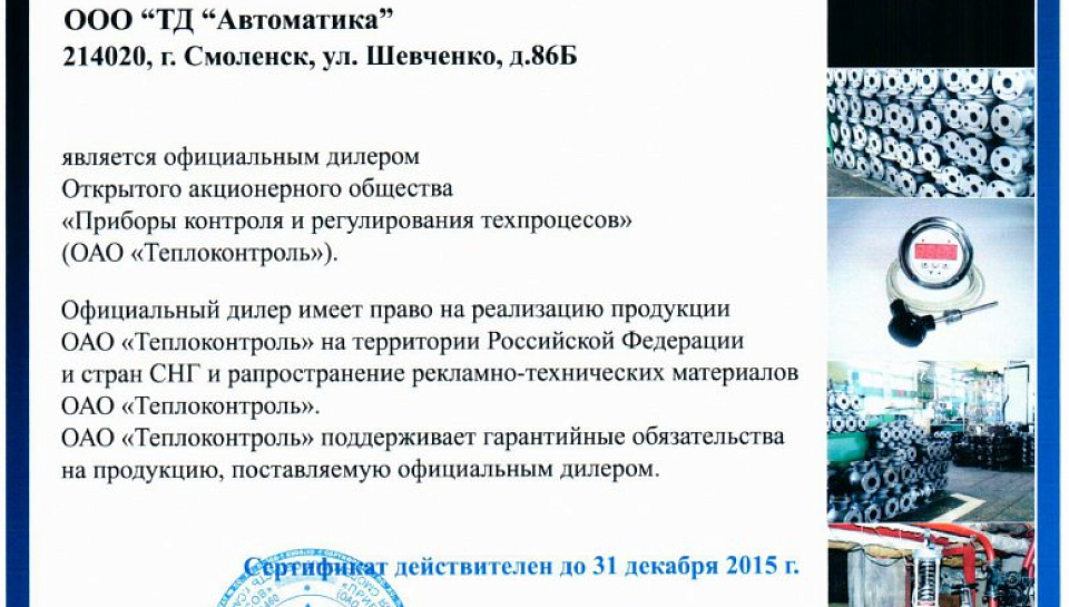 Сертификат официального дилера ОАО "Теплоконтроль"