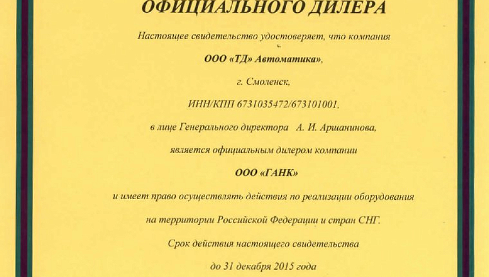Получены Свидетельства официального дилера ООО "ГАНК" и ООО "НПО "Прибор" ганк" на 2015 год.