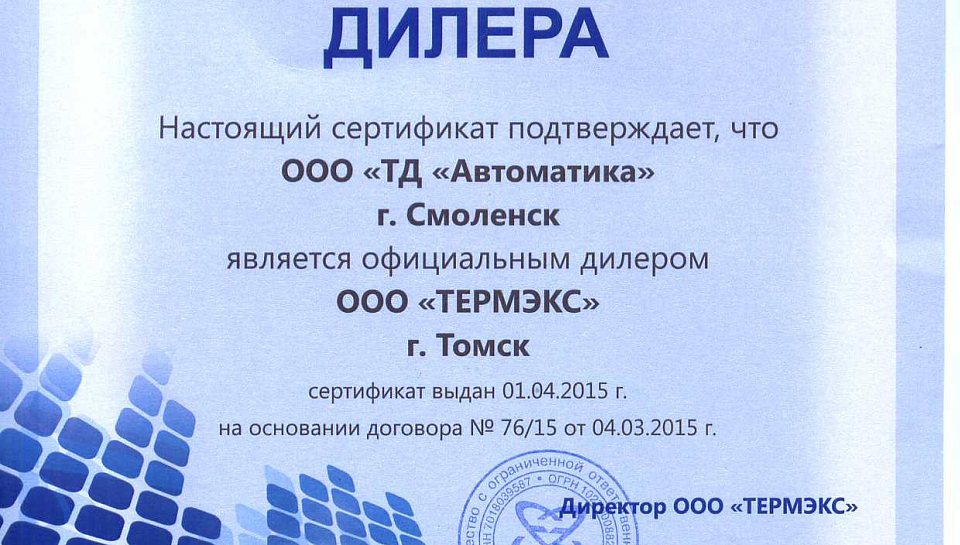 ООО "ТД "Автоматика" является официальным дилером ООО "ТЕРМЭКС".