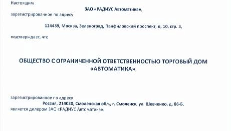 ООО "ТД "Автоматика" получило статус дилера ЗАО «РАДИУС Автоматика» и ООО НПФ "РАДИУС".