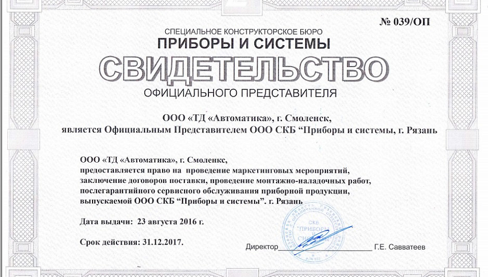 Продлены полномочия ООО "ТД "Автоматика" как Официального Представителя ООО СКБ "Приборы и системы", получено соответствующее Свидетельство.