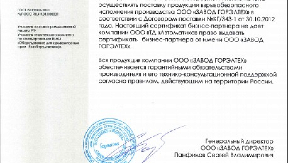 Нами получен Сертификат бизнес-партнера ООО "Завод ГОРЭЛТЕХ", г. Санкт-Петербург - крупнейшего российского производителя современного взрывозащищённого электрооборудования.