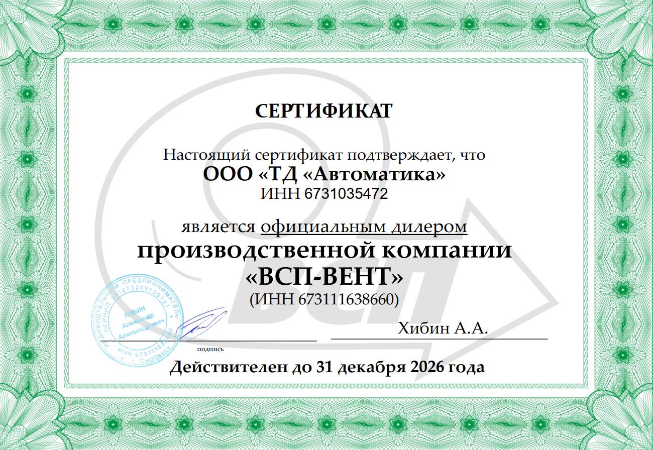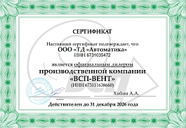 Сертификат официального дилера ПК "ВСП-ВЕНТ" (ИП Хибин А.А.)